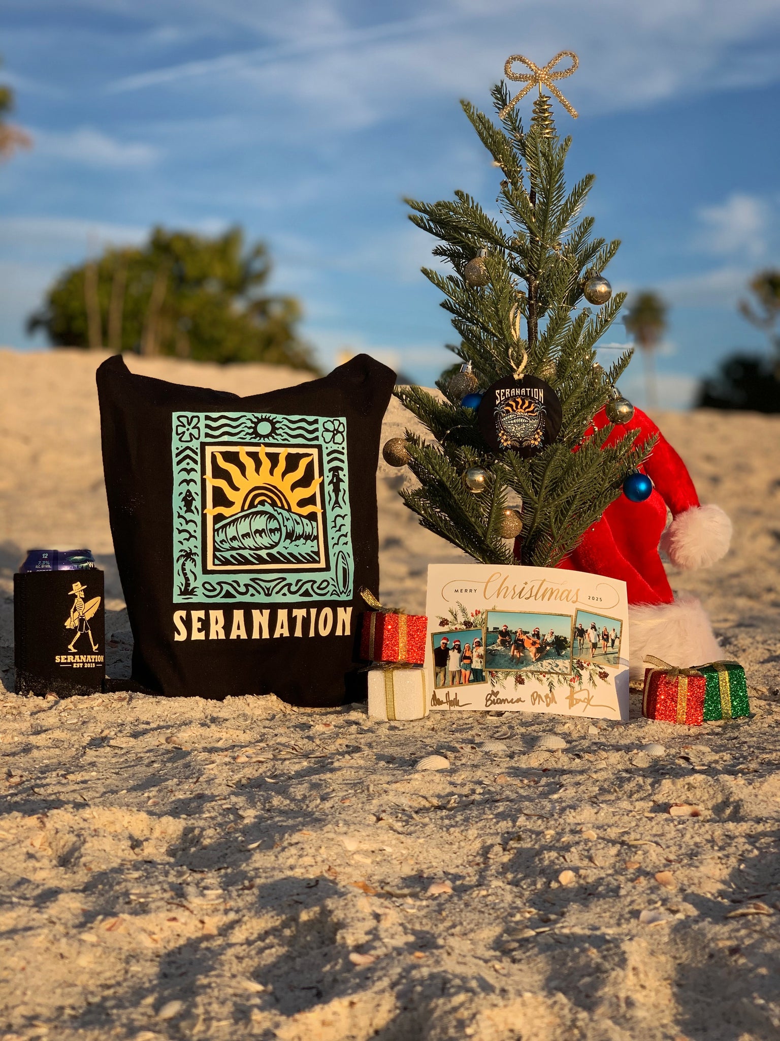 The Christmas Bundle includes a Seranation ornament, signed Christmas card, tote bag, pin, keychain, koozie and sticker pack